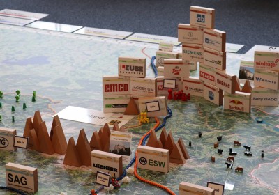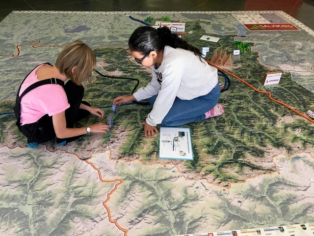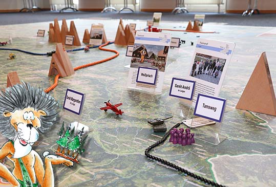 Statt mit dem Finger auf der Landkarte, bewegen wir uns zu Fuß auf einem überdimensionalen Abbild unseres Bundeslandes und verwandeln dieses durch Auslegen von Materialien in eine lebendige 3D Landschaft.