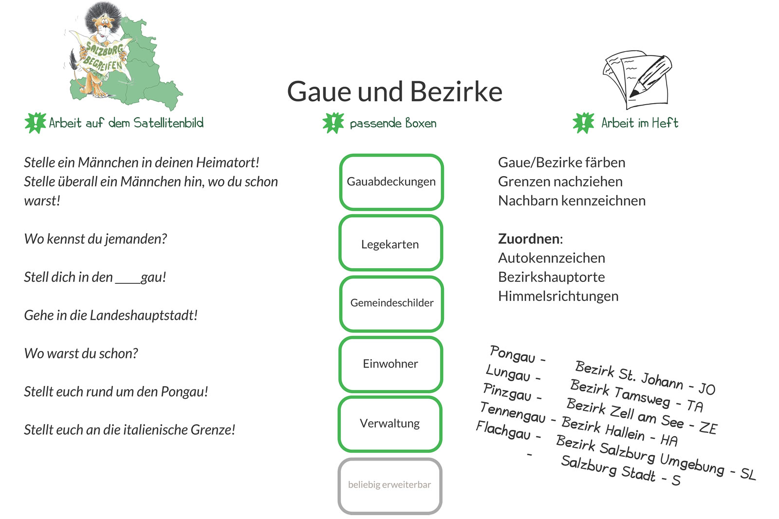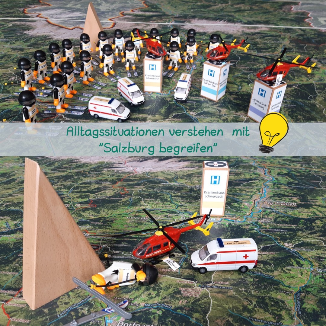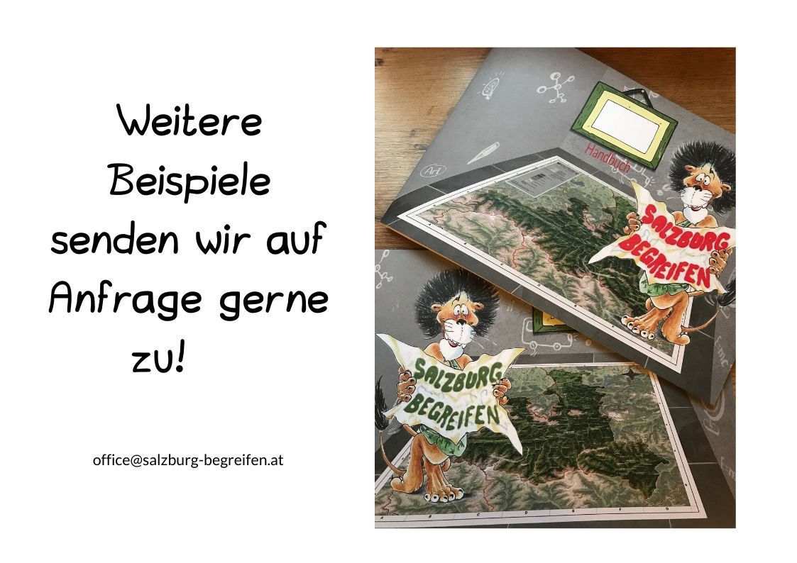"Das Material ist für die Kinder sehr ansprechend und motivierend. Es hat ihnen großen Spaß gemacht die unterschiedlichsten Dinge auf der Karte zu suchen. Gleichzeitig vermittelt das Endbild (z.B. wenn alle Berge auf der Karte stehen) sehr deutlich welche Besonderheiten die einzelnen Gaue ausmachen. Eine kleine Überprüfung zu den behandelten Themen zeigte auch, dass sich die Kinder sehr viel gemerkt haben. Auf der Homepage von Salzburg begreifen habe ich dazu tolle Anregungen gefunden. Alles in allem finde ich das Material genial und würde auf alle Fälle wieder mit einer 3. oder 4. Klasse zu euch kommen."