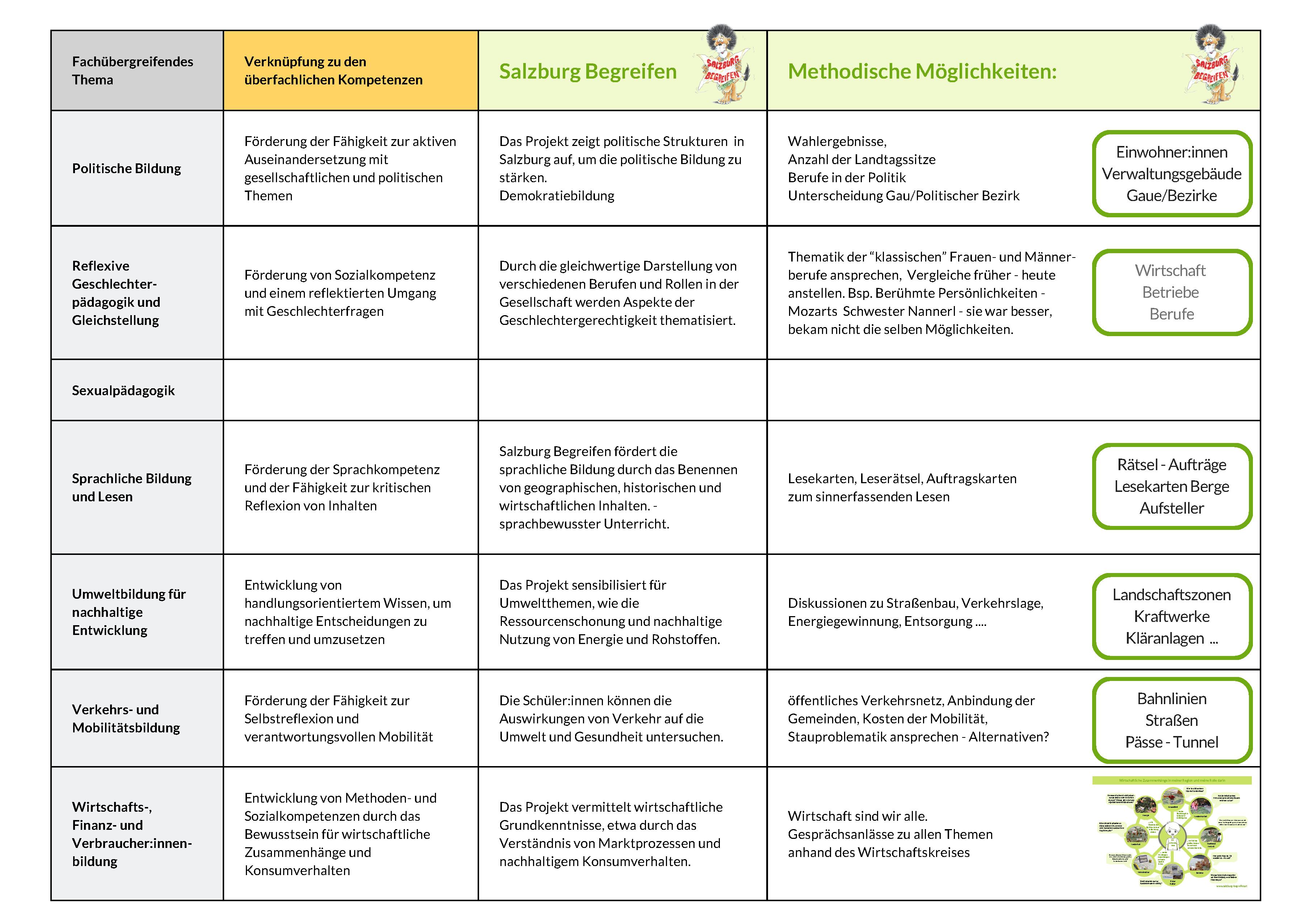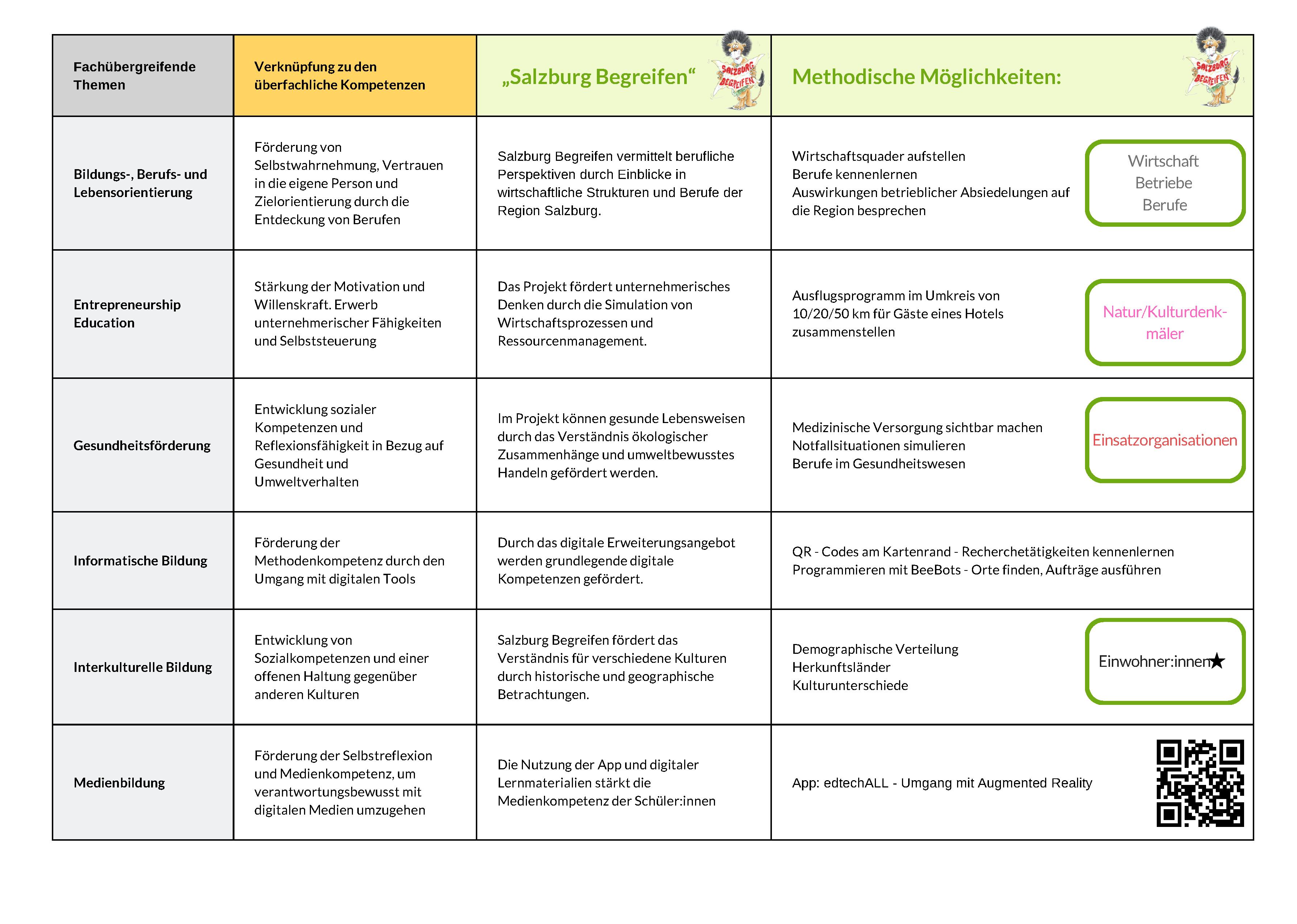 Salzburg Begreifen trägt zur Förderung dieser drei Kompetenzgruppen bei, indem es eine praxisorientierte und fächerübergreifende Herangehensweise bietet. Es ermöglicht den Schüler:innen, durch interaktive Lernmaterialien und Anwendungsbeispiele, Zusammenhänge zwischen geografischen, historischen und wirtschaftlichen Aspekten zu verstehen. In Verbindung mit den 13 übergreifenden Themen im Lehrplan entwickeln Schüler:innen hier sowohl fachliche, als auch überfachliche Kompetenzen.